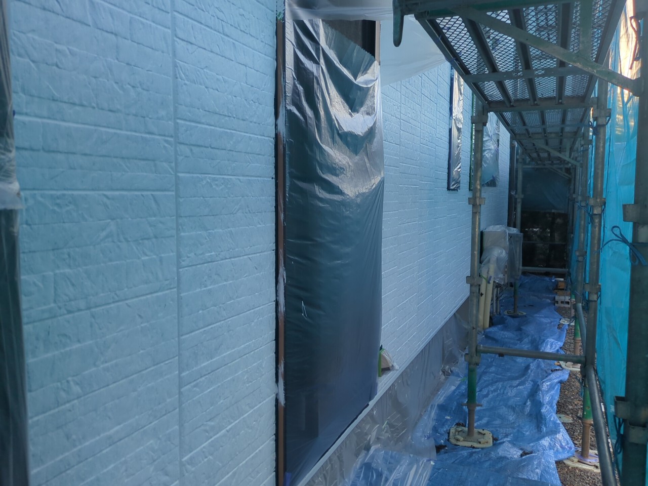 高圧洗浄でしっかりと外壁表面のチョーキングを除去し、下塗を丁寧に行うことで塗膜の密着性が向上するよう施行しました。