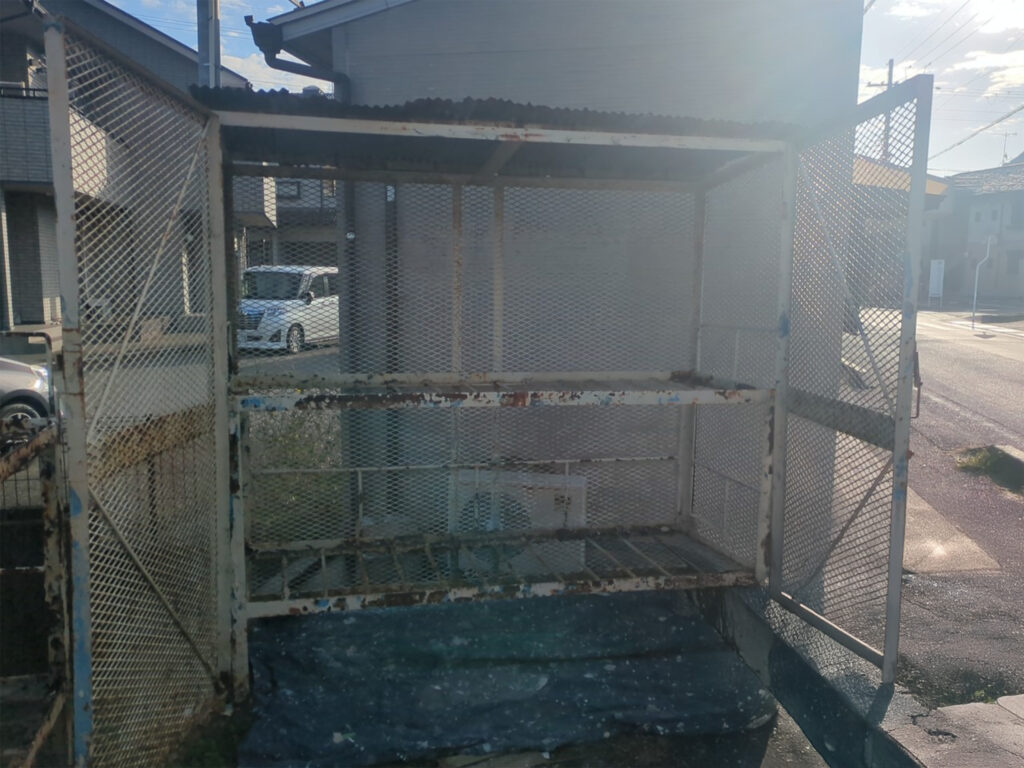 ゴミステーションの屋根と止め金具が錆で外れてしまっていたので、カラートタンを新しくつけ直すことで復旧いたしました。