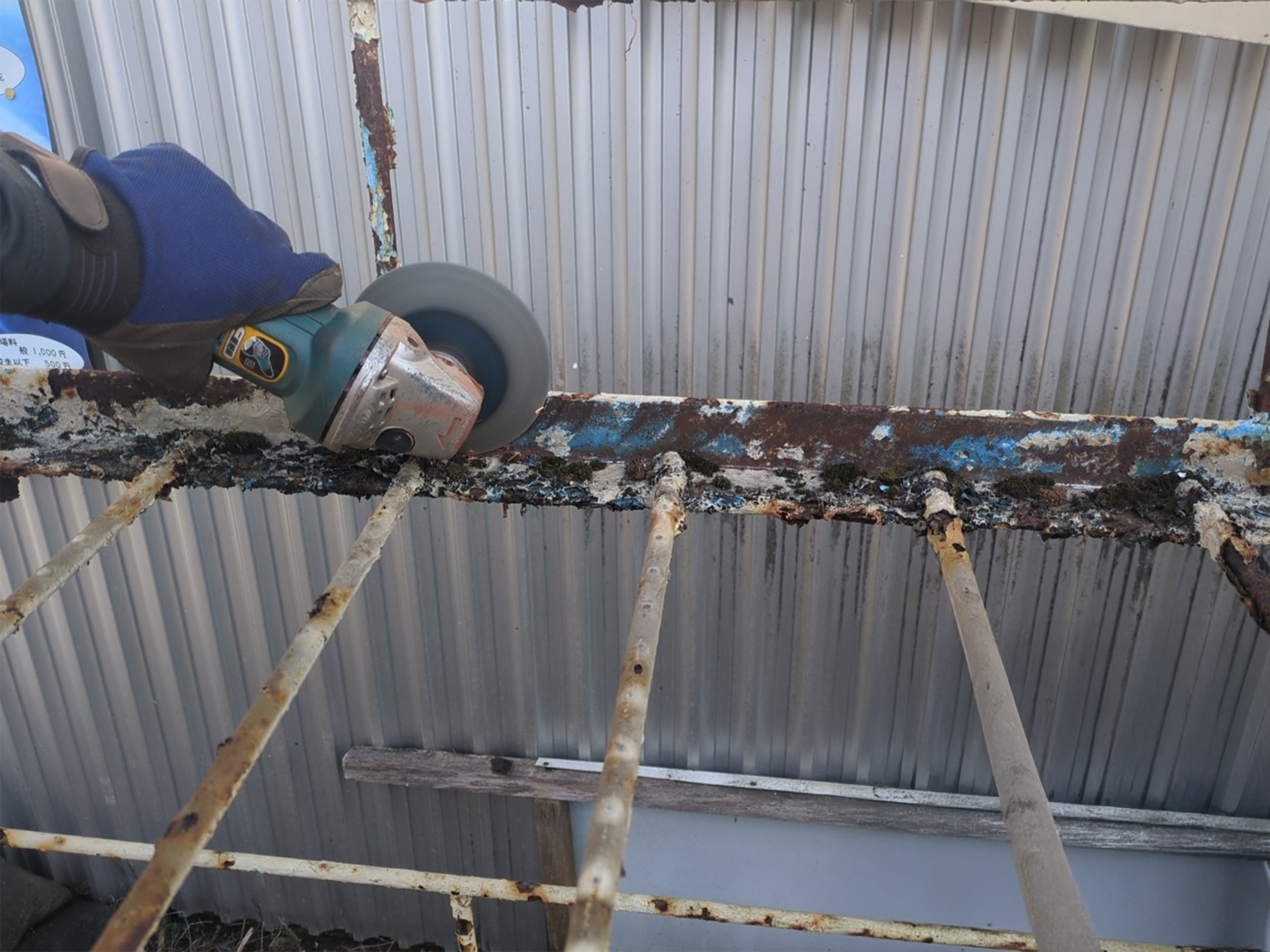 そのため電気工具のサンダーを使用して、既存塗膜と錆をできるだけ除去し、十分な錆止め効果と密着性を保てるように下地処理を丁寧に行いました。
